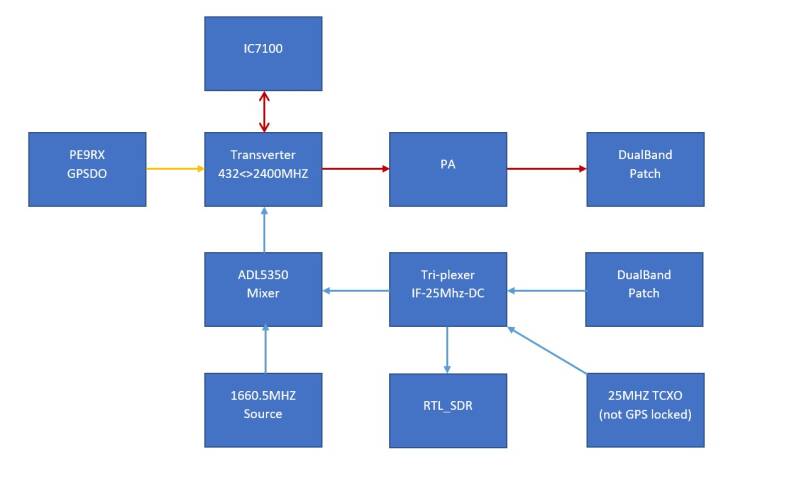In this setup i have created a up-converter with the ADF Programmer, with a HMC213 mixer to have the signal from the LNB (749MHZ Converted to 2.4GHZ.)